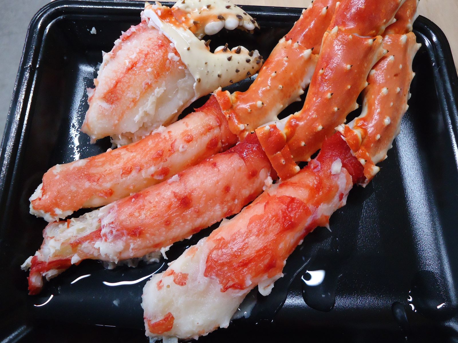 ①氷の膜だけを流水で溶かし、カニの本体は凍結状態のまま冷蔵庫の中でゆっくりと自然解凍してください。